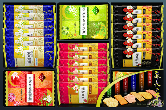 海老カレー煎餅×6枚、黒ごま入り玄米煎餅×6枚、海老胡椒煎餅×6枚、えびまめ花煎餅×3枚、つぶやきサラダ煎餅×3枚、金澤カレー煎餅×3枚 計27枚12箱