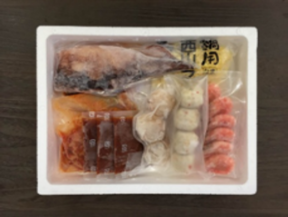 白菜キムチ100g×2袋、ボイル海老6尾、ボイル帆立3個、えび入つみれ4個、ツボ抜きいか100g×1尾、油揚げ2枚、冷凍生ラーメン80g×1玉、たれ(濃縮:キムチ仕立て)30g×3袋(2~3人前)