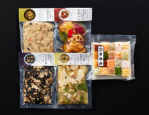 なみはや寿司(鯖、海老、サーモン、穴子、鯛、昆布、カニ、大根酢〆、高菜×各2、玉子×1、玉子焼き×1(ごはん無し))×1、九種の具材の田舎おから煮150g×1、巨粒大豆と湯葉ひじき煮150g×1、湯葉と長州鶏の和風あん150g×1、長州鶏湯葉唐揚げと彩り野菜の黒酢あん150g×1■賞味期限:冷凍60日