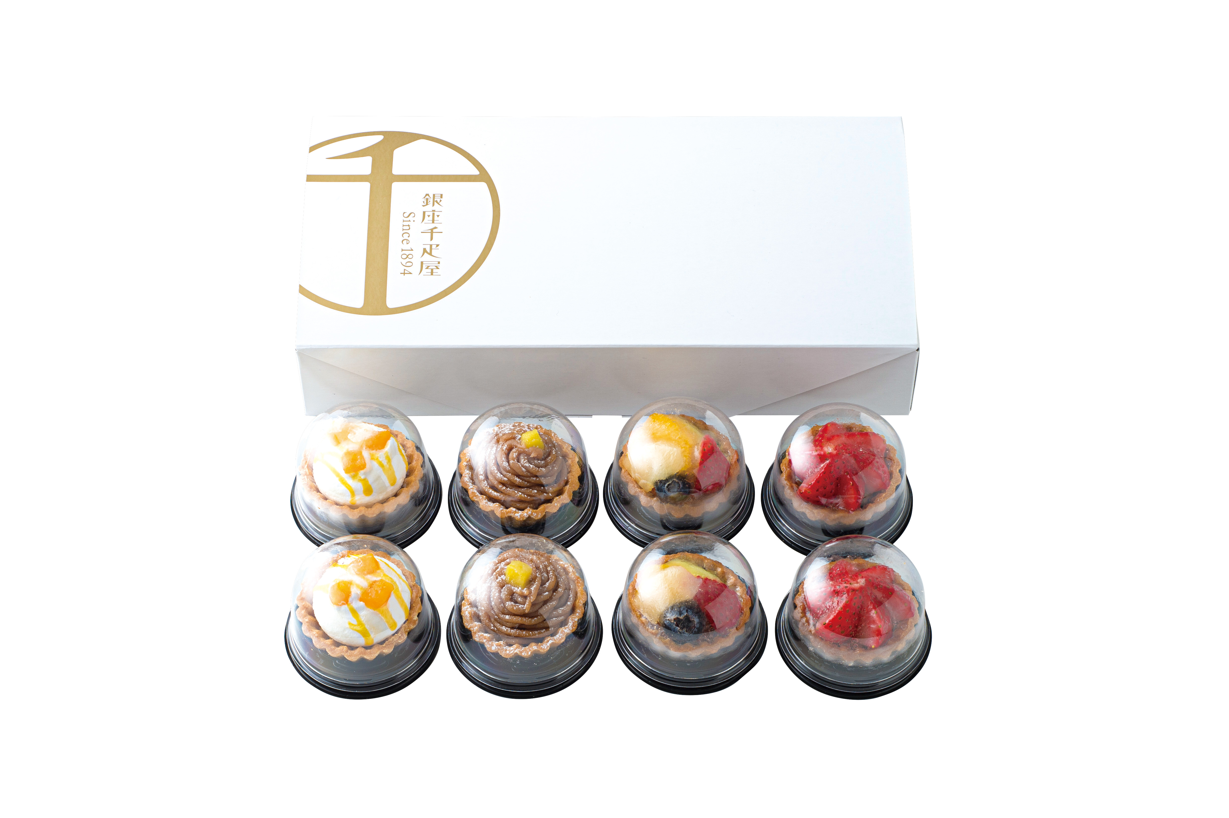 手のひらサイズのタルトに甘さ控えめのクリームやムース、色とりどりのフルーツを飾った銀座千疋屋オリジナルのフルーツタルト詰合せです。